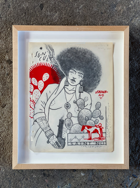 SAINT NO "Sun Cult" | 8.5x11 acrylic, gesso, pencil on found paper in natural wood frame